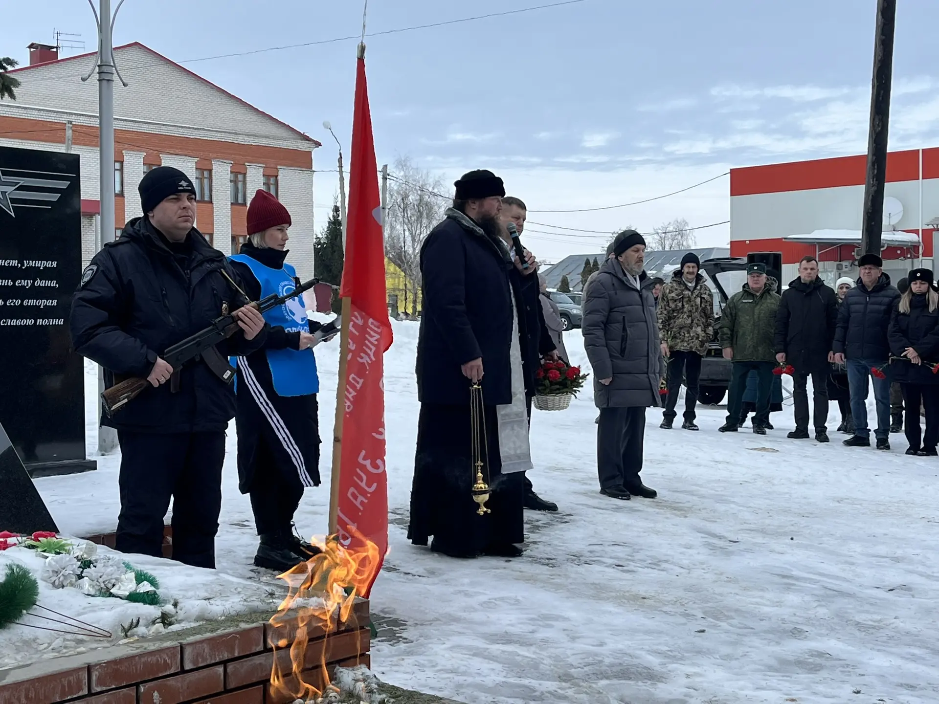Благочинный Мантуровского церковного округа протоиерей Андрей Еськов прочёл молитву по павшим на поле брани воинам.